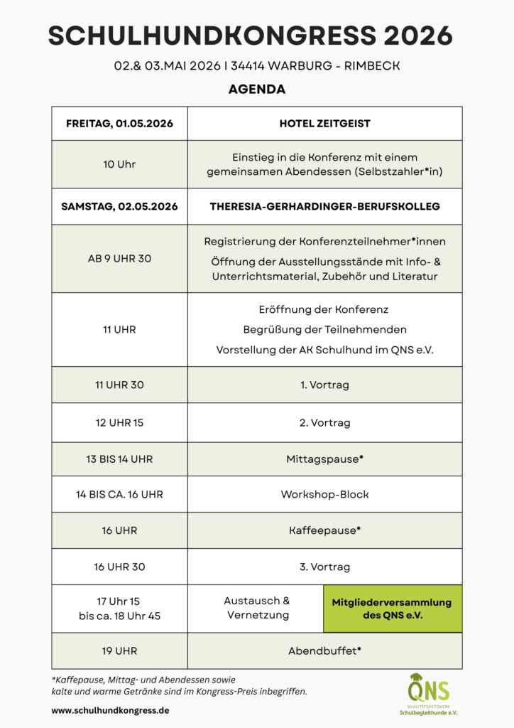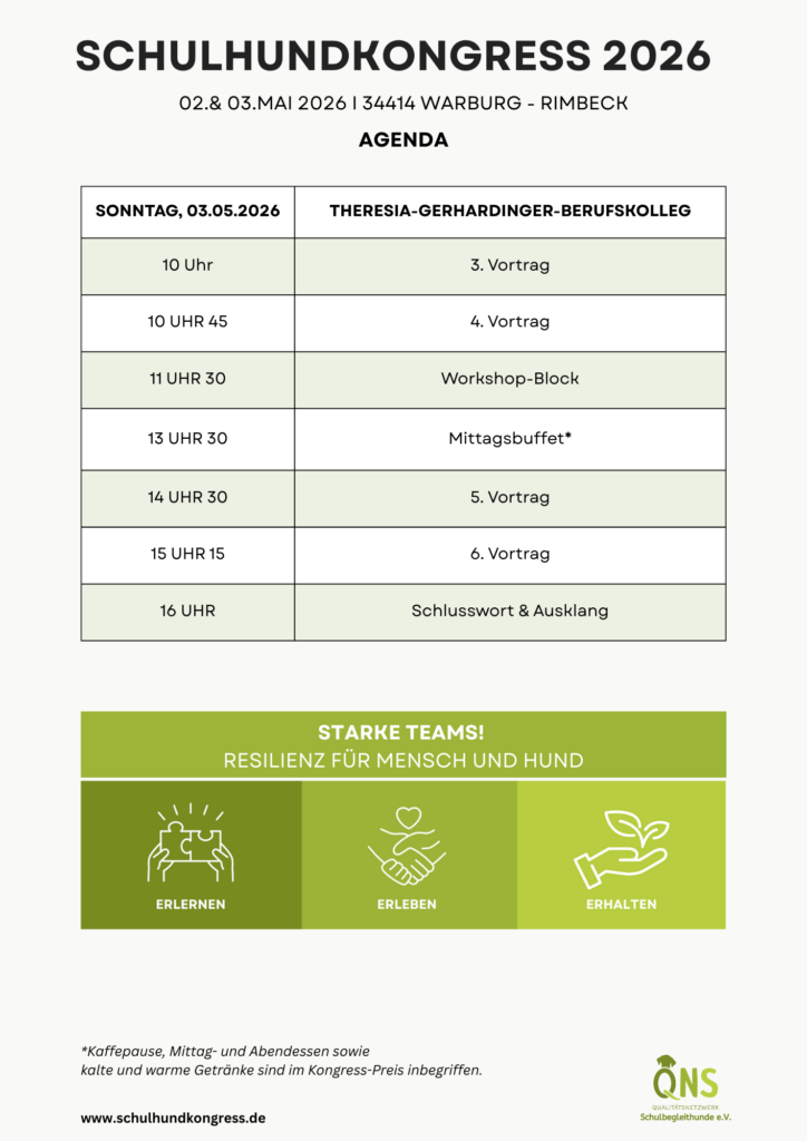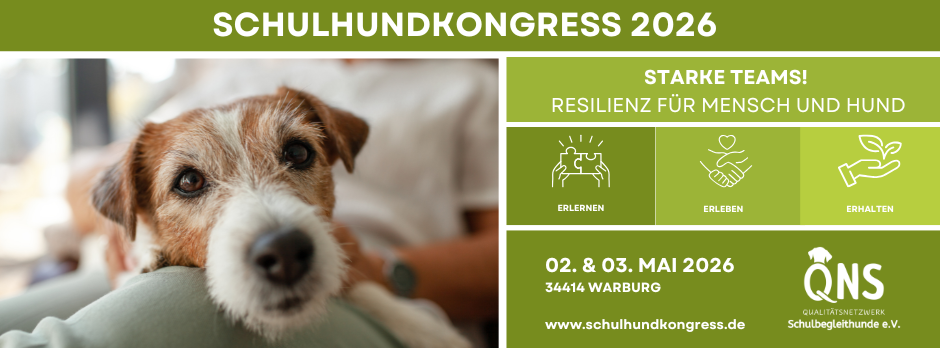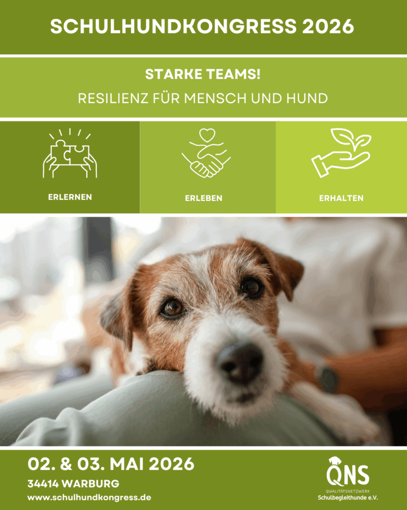 Der 6. Schulhundkongress des QNS e.V. trägt den Titel „Starke Teams – Resilienz für Mensch und Hund – erlernen, erleben, erhalten“ und findet am 2. & 3.Mai 2026 am Theresia-Gerhardinger-Berufskolleg in 34414 Warburg statt.